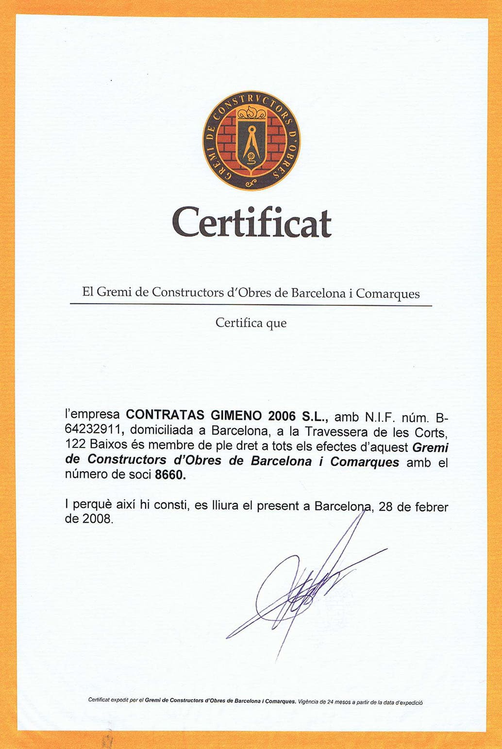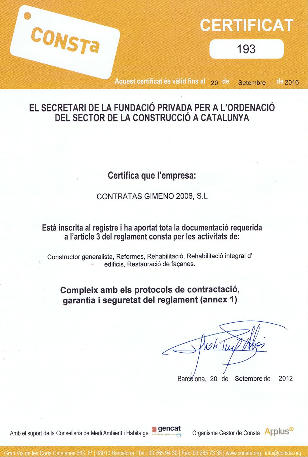 Contratas Gimeno dispone de una serie de certificados que legitiman su trabajo.
